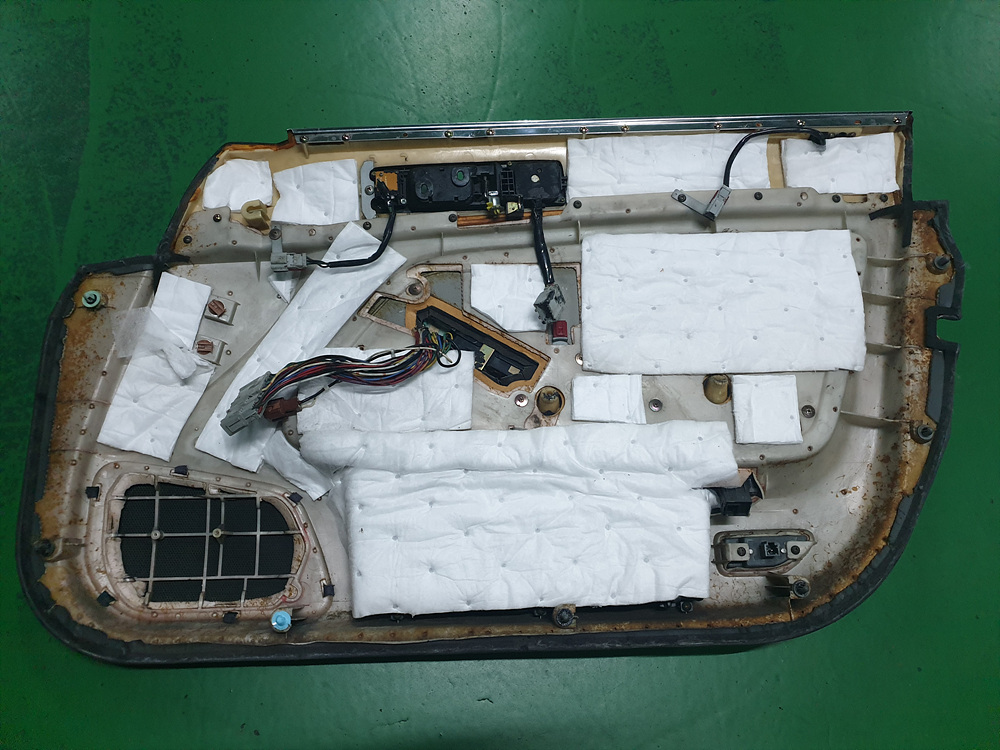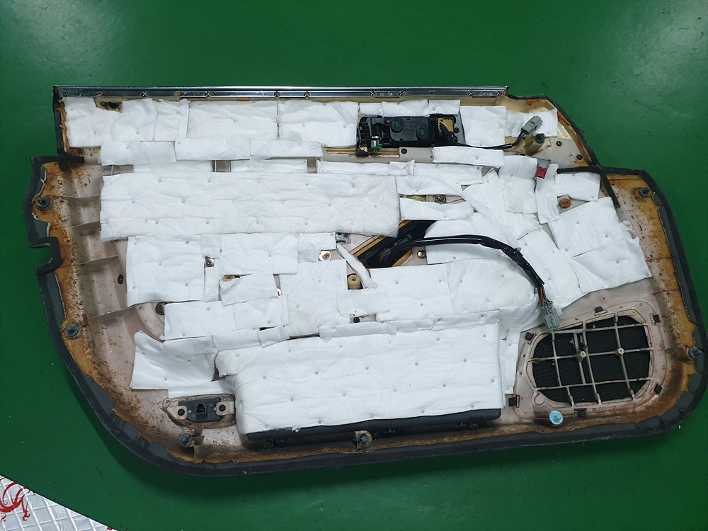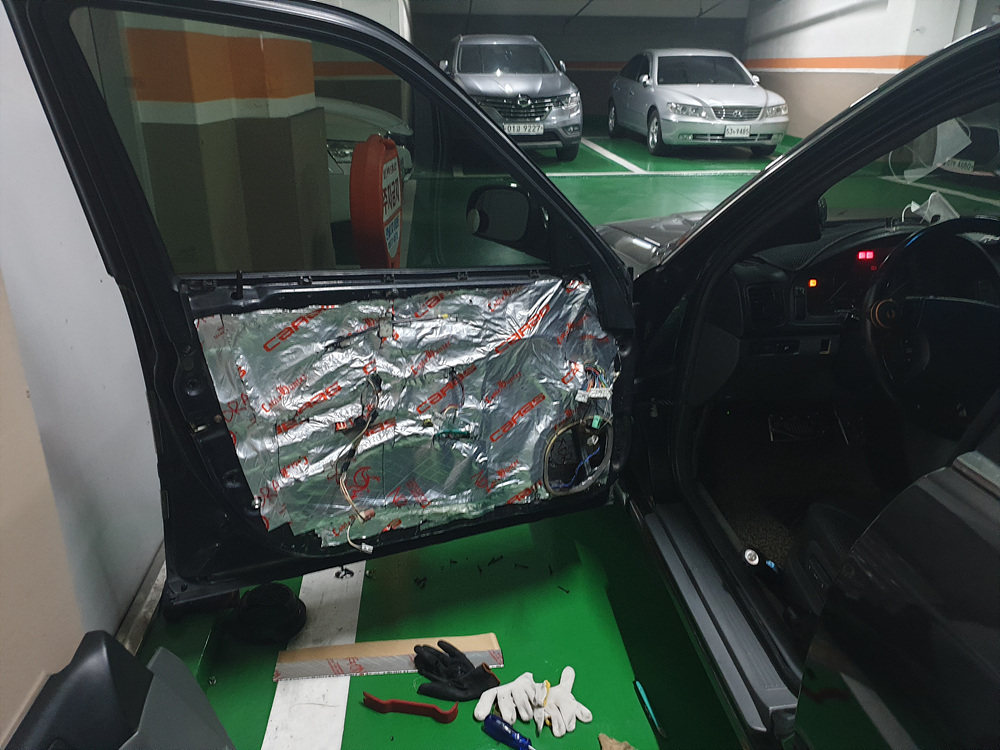 앞문짝 안쪽 철판에 최대한 방음지를 많이 붙였습니다.